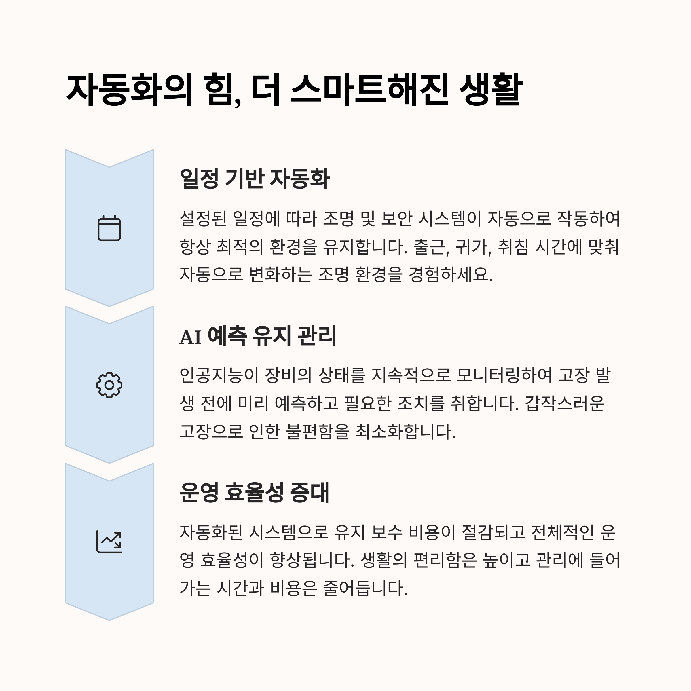 | 스마트홈 자동화는 가정 생활을 더 편리하고 안전하게 만듭니다. 원격 제어로 외부에서도 집 안의 여러 장치를 관리할 수 있습니다. 음성 명령과 AI 통합으로 사용 편의성을 극대화합니다. 스케줄 자동화로 주기적인 작업 부담이 줄어듭니다. 통합 보안 시스템을 통해 더욱 안전한 환경을 제공합니다. |