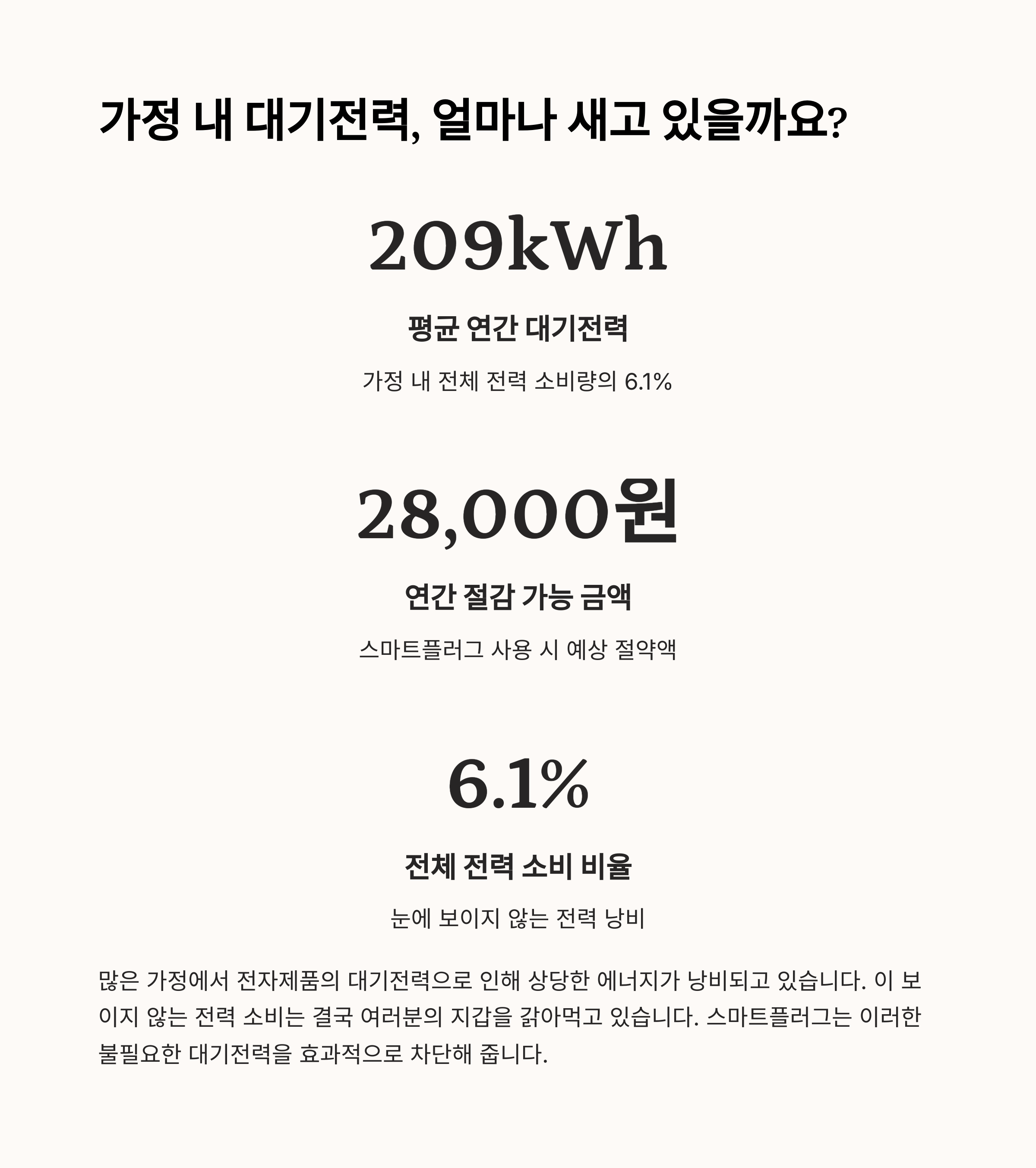 대기전력을 최대 80% 줄이고, 연간 전기 요금 28,000원 절감을 기대할 수 있습니다.