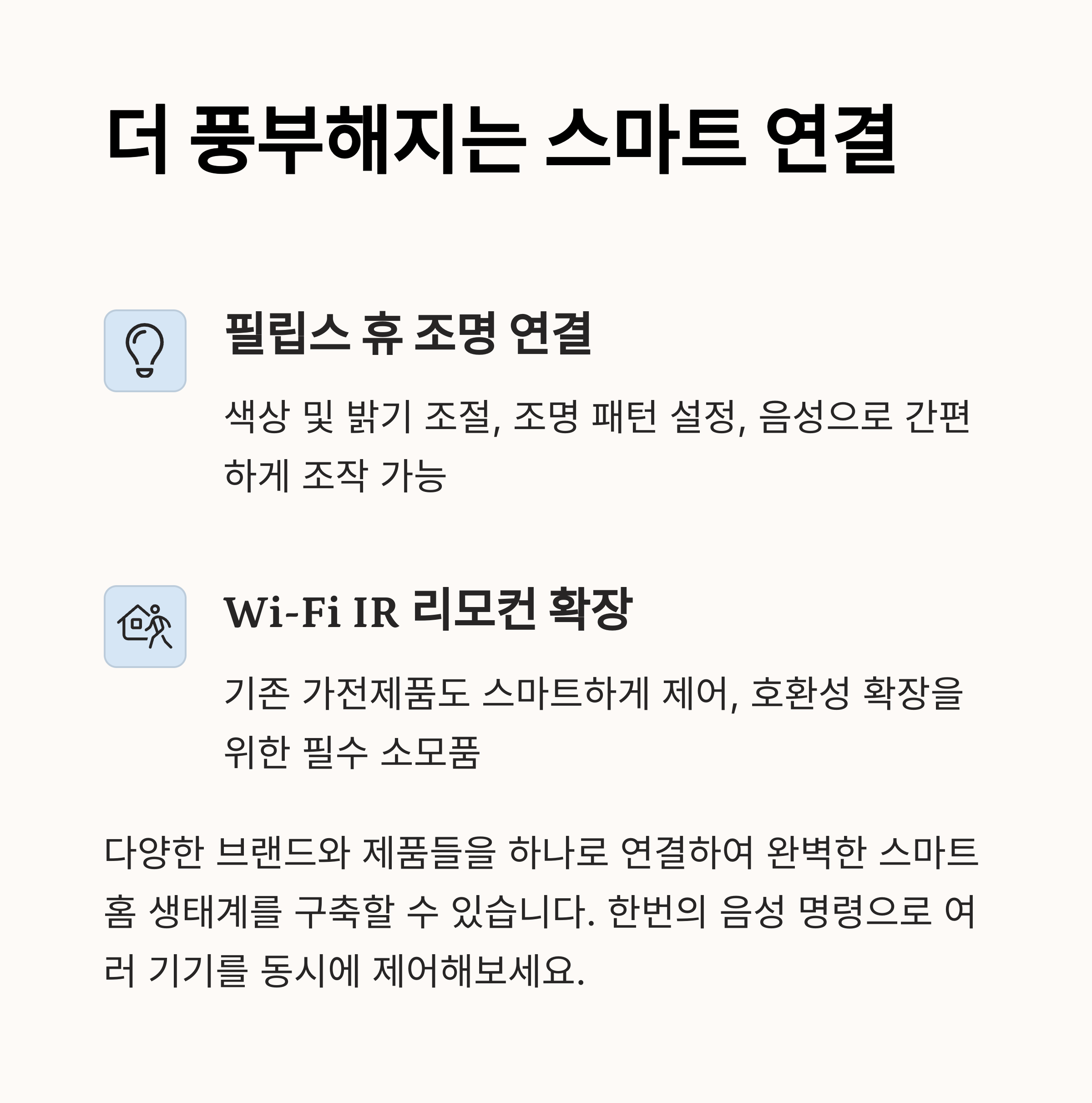 | AI 스피커와 스마트 기기의 연결은 필수입니다. Wi-Fi 기반 장치가 있는 경우, AI 스피커와 직접 연결이 가능합니다. 비 Wi-Fi 지원 기기는 일반적으로 Wi-Fi IR 리모컨을 추가로 사용해야 합니다. 스마트 조명은 브랜드별 전용 애플리케이션 설정 후 AI 스피커와 연동합니다. 스마트 허브를 사용하면 다양한 기기를 통합적으로 연결하여 제어 가능해집니다. |