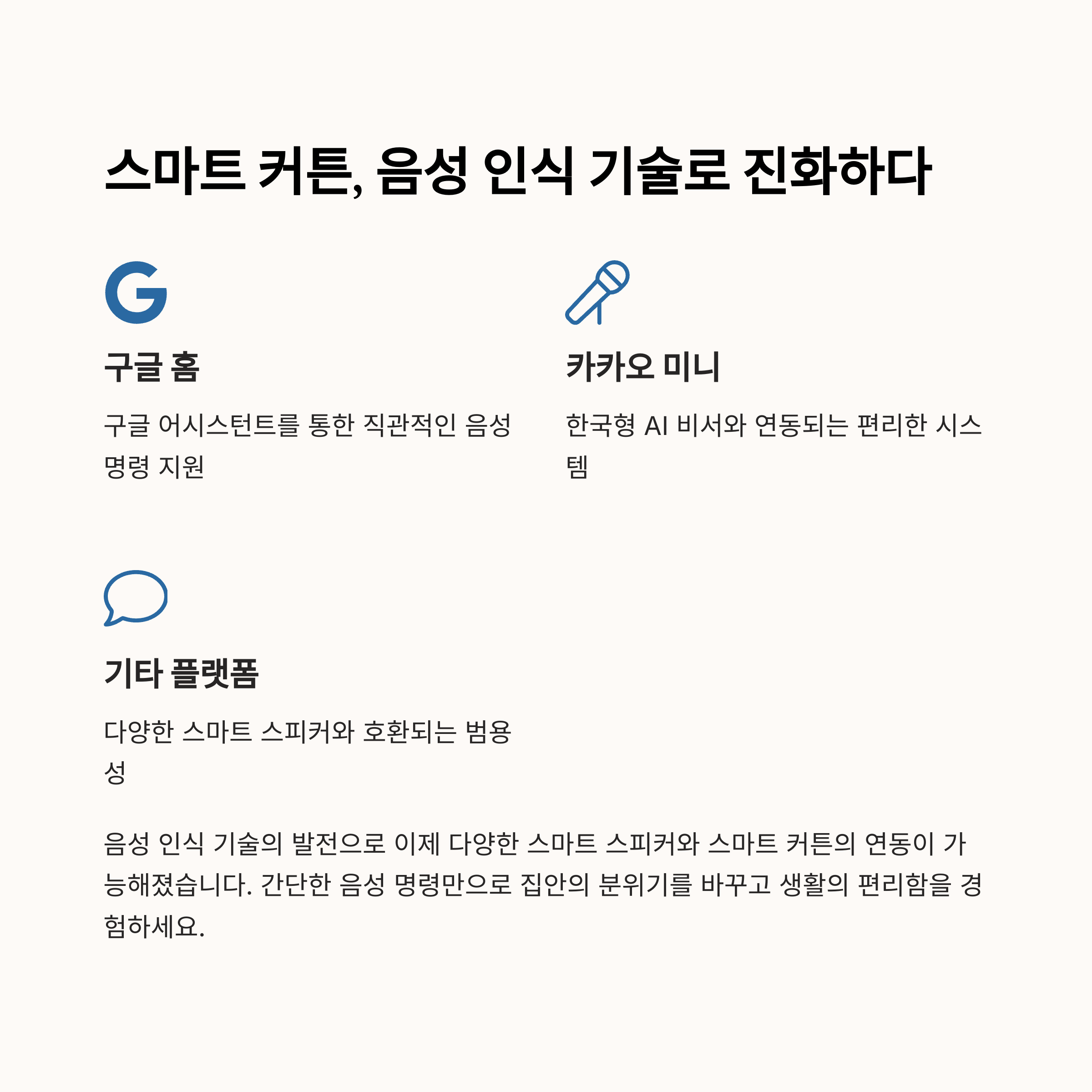 사용자가 스마트폰 없이 음성으로 커튼을 열고 닫을 수 있다는 점은 생활의 질을 크게 향상시킵니다.