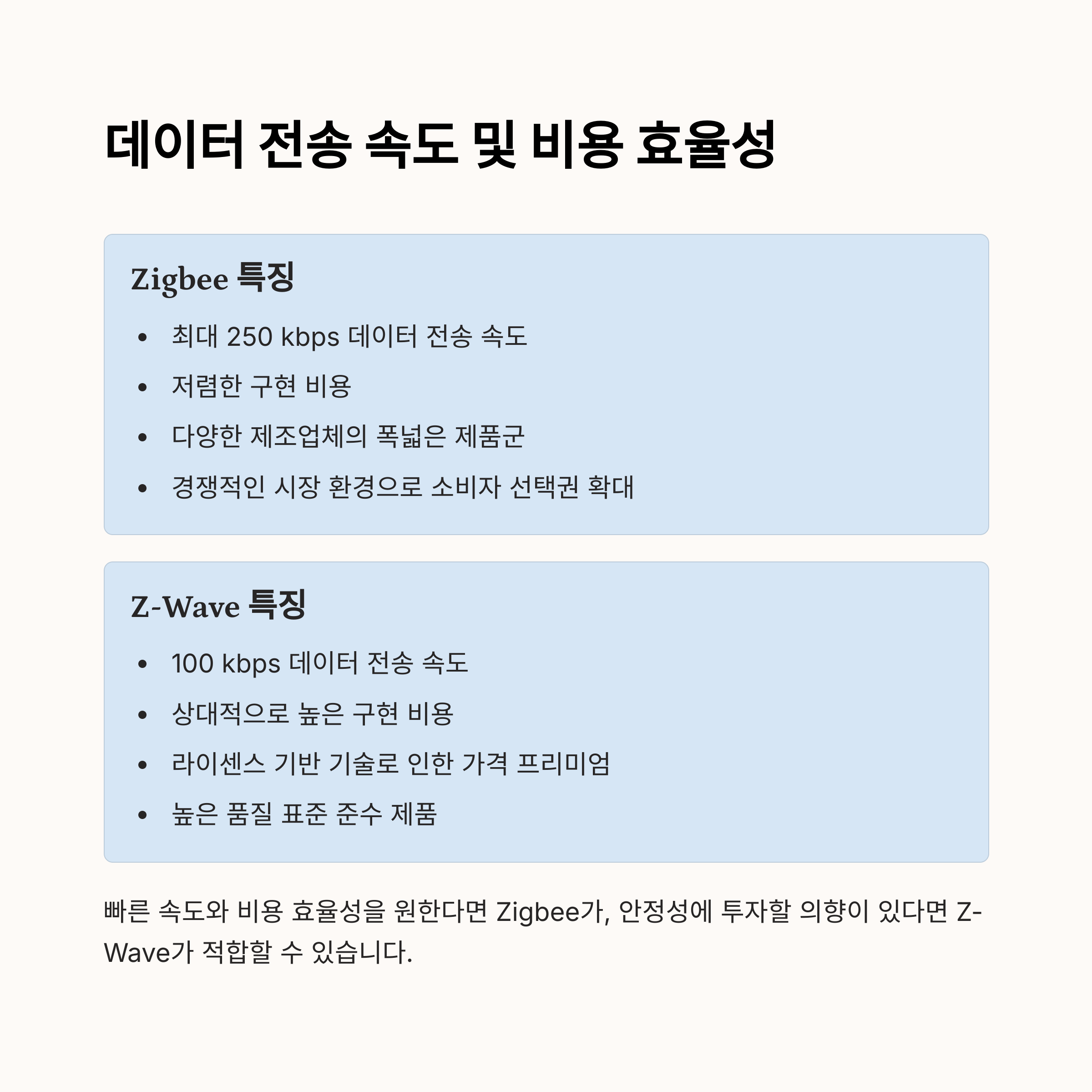 안정적인 연결성과 간섭이 적은 환경이 필요하다면 Z-Wave가 유리합니다.