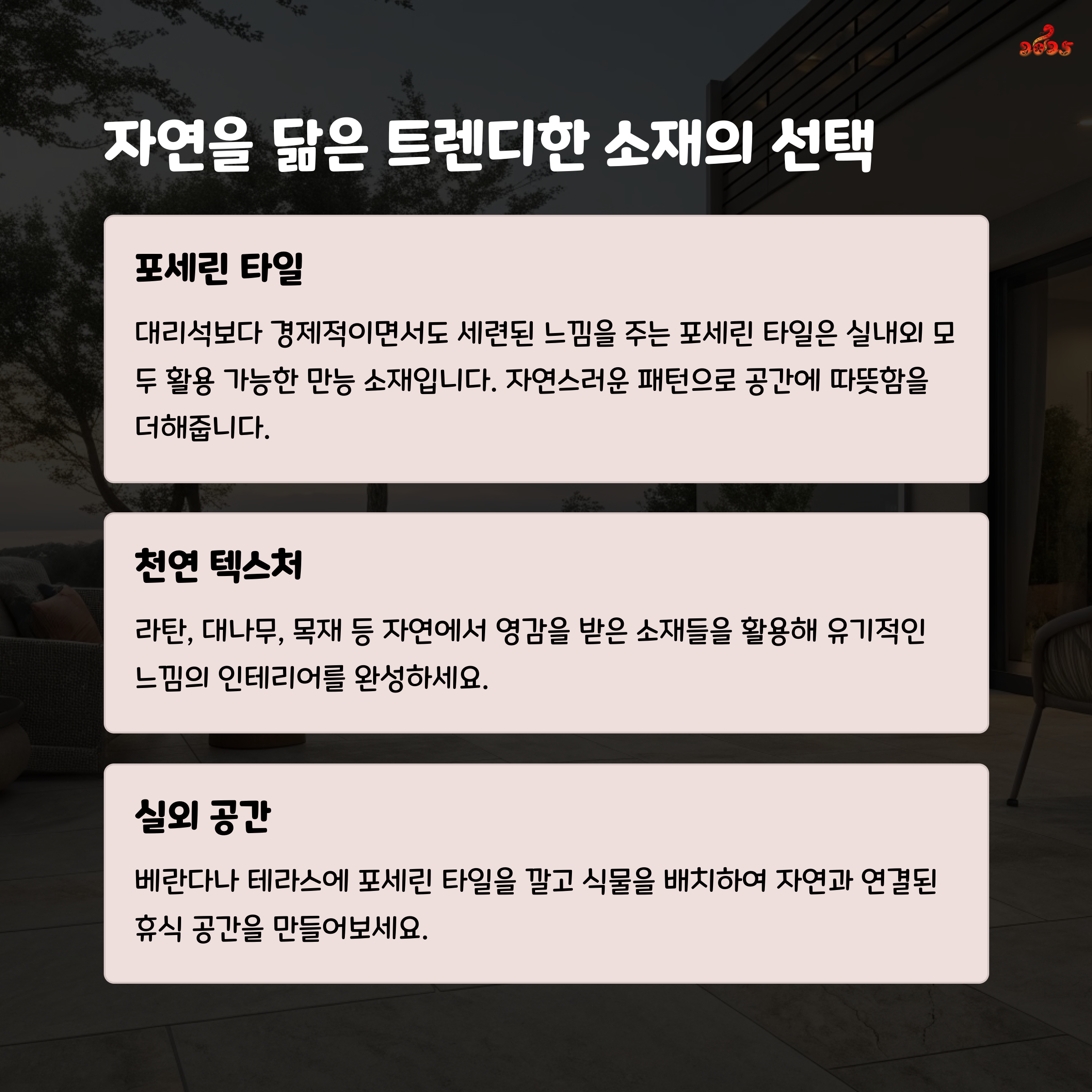 포세린 타일과 화사한 식물을 결합하면 실내외 공간 연결감을 강조할 수 있습니다.