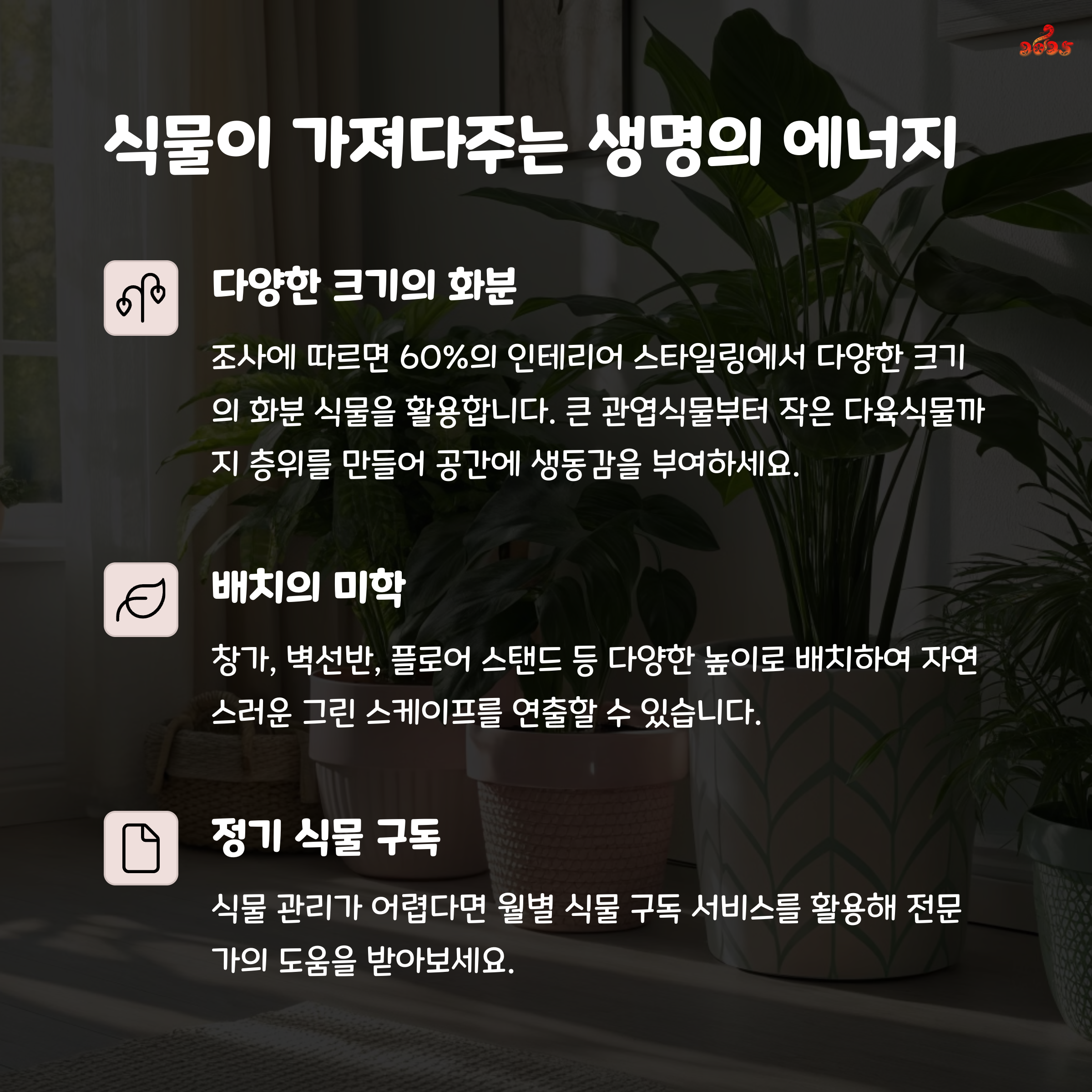식물 배치는 창가나 거실 등 햇빛이 잘 드는 장소를 권장합니다.