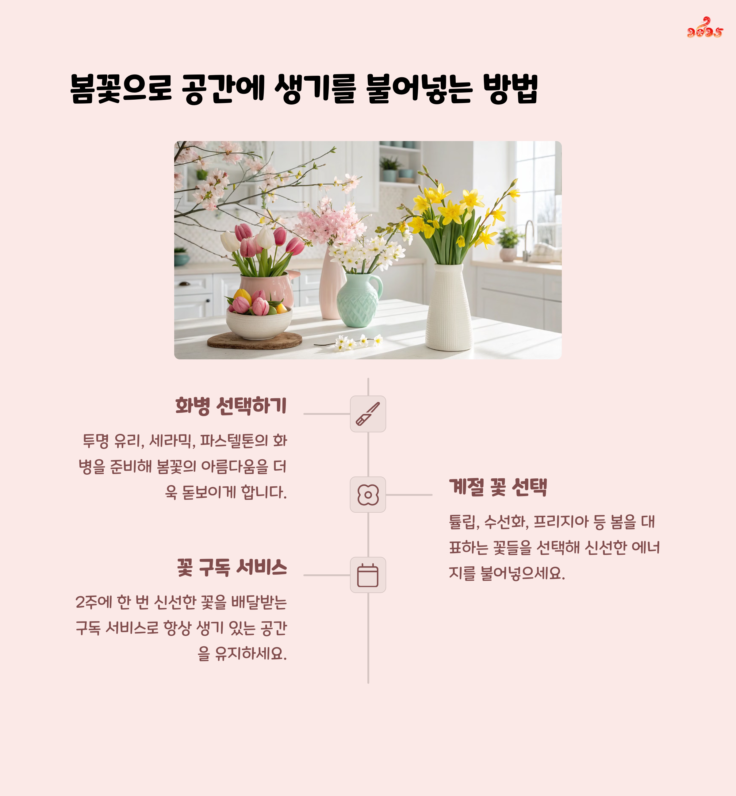 봄꽃이나 화병을 활용하면 계절감을 빠르게 느낄 수 있습니다.