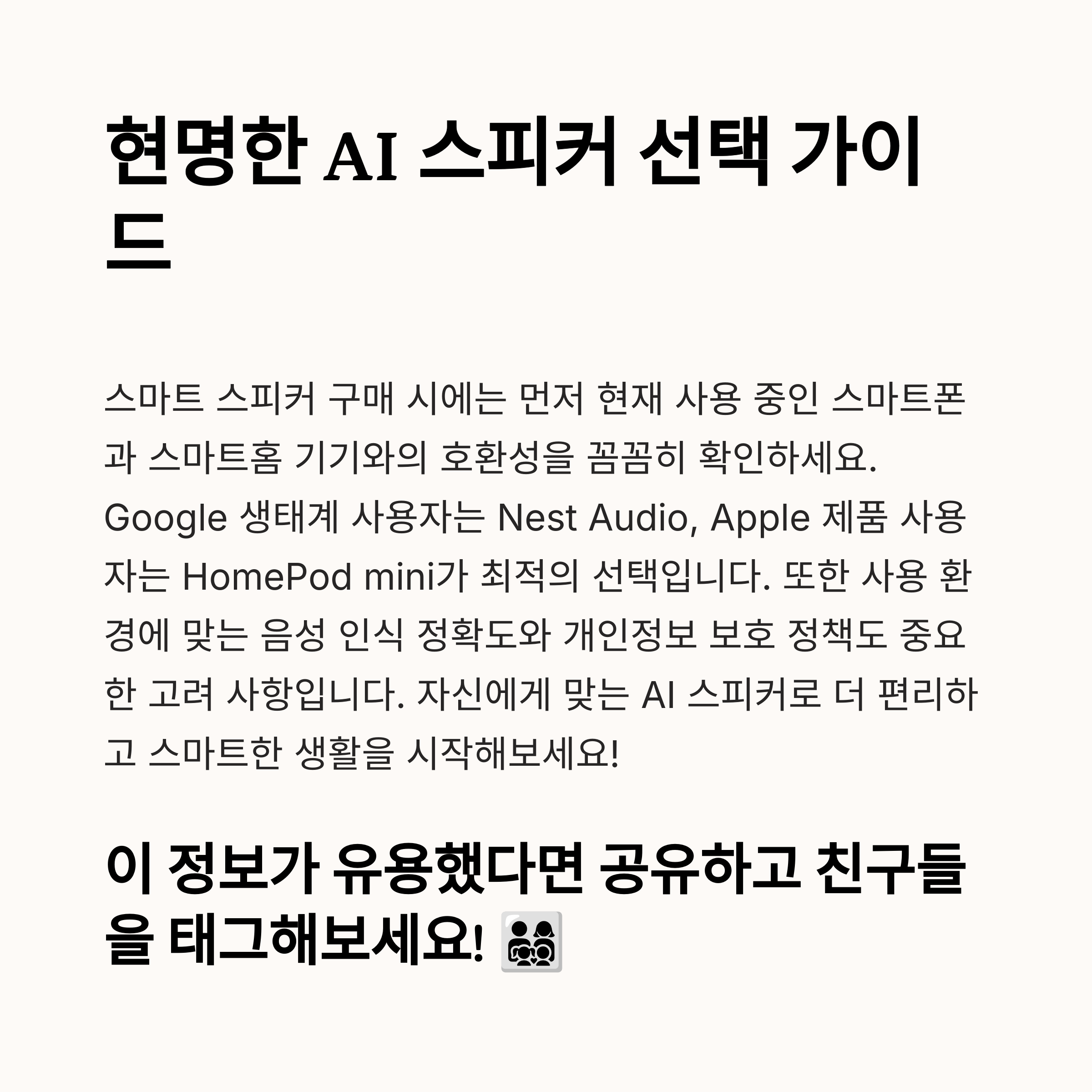 | 스마트 스피커를 선택할 때 가장 중요한 요소는 사용자의 필요와 사용 환경입니다. AI의 성능은 스마트 스피커의 핵심입니다. 음성 명령 처리와 자연어 이해력을 기반으로 선택하세요. 호환성 또한 중요한 요소입니다. 사용 중인 스마트홈 디바이스와 얼마나 잘 연동되는지 확인이 필요합니다. 음질 역시 고려해야 할 요소입니다. 특히 음악 감상용으로 사용할 경우 사운드 품질이 중요합니다. 가격은 사용자가 정해야 할 마지막 기준입니다. 예산에 맞는 모델을 선택하세요. |