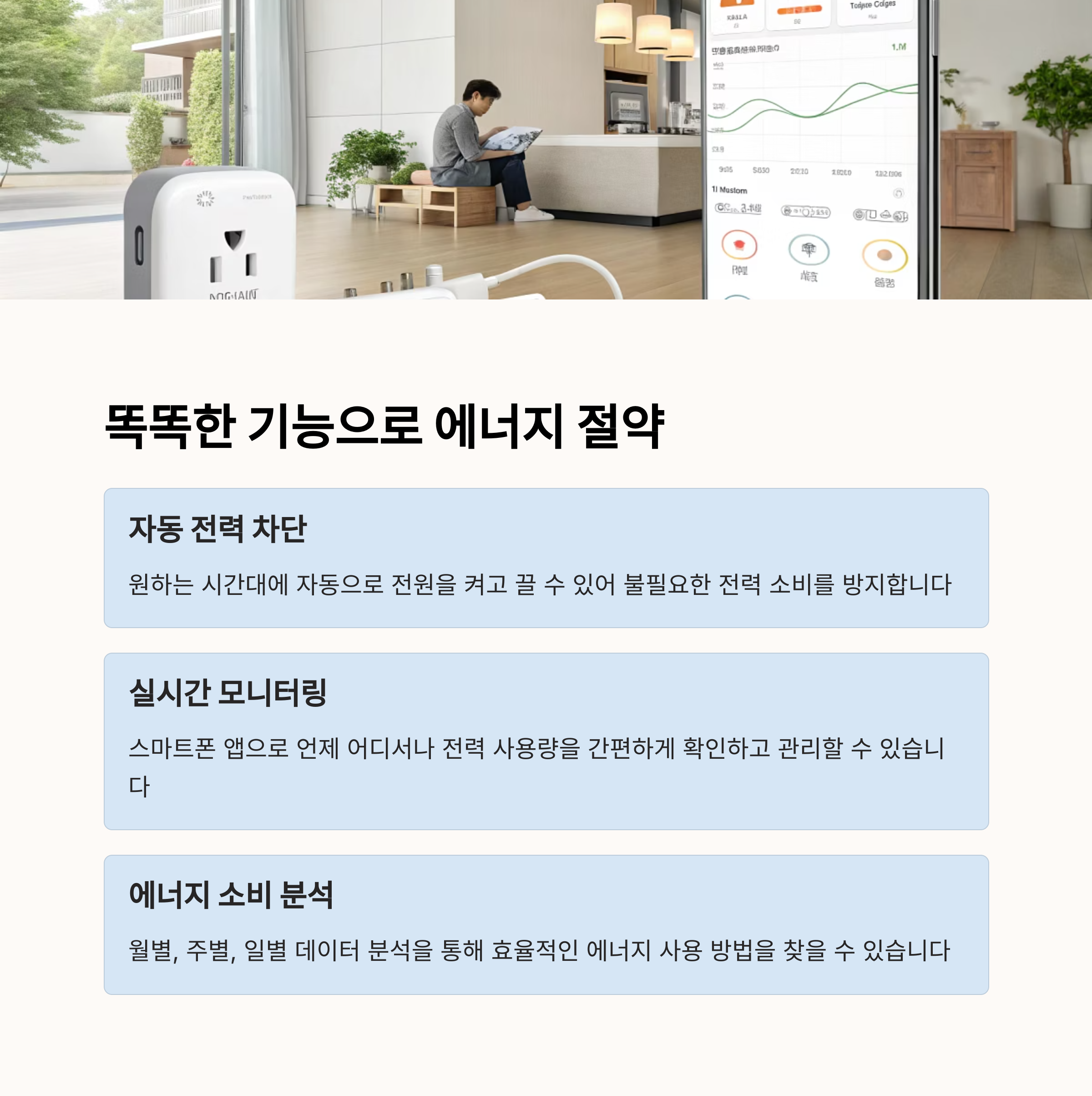 이 장치는 대기전력을 자동으로 차단하거나 실시간으로 사용량을 모니터링하는 기능을 제공해 전기 낭비를 최소화합니다.