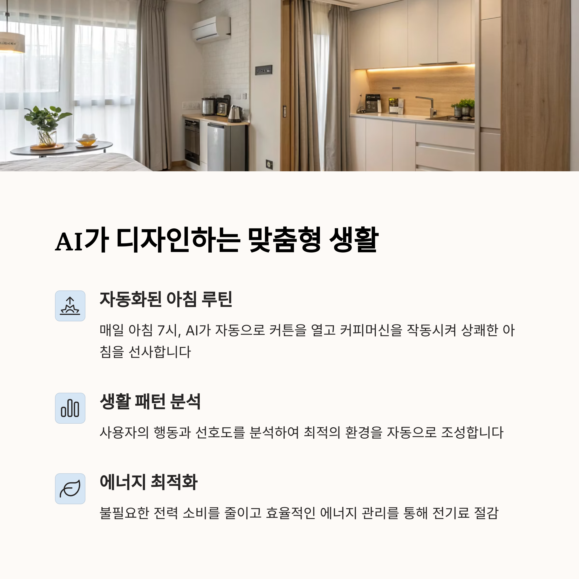 AI 기술은 사용자의 생활 패턴을 학습하여 맞춤형 환경을 제공합니다. 매일 아침 특정 시간에 커튼을 자동으로 열고 조명을 점등할 수 있습니다.