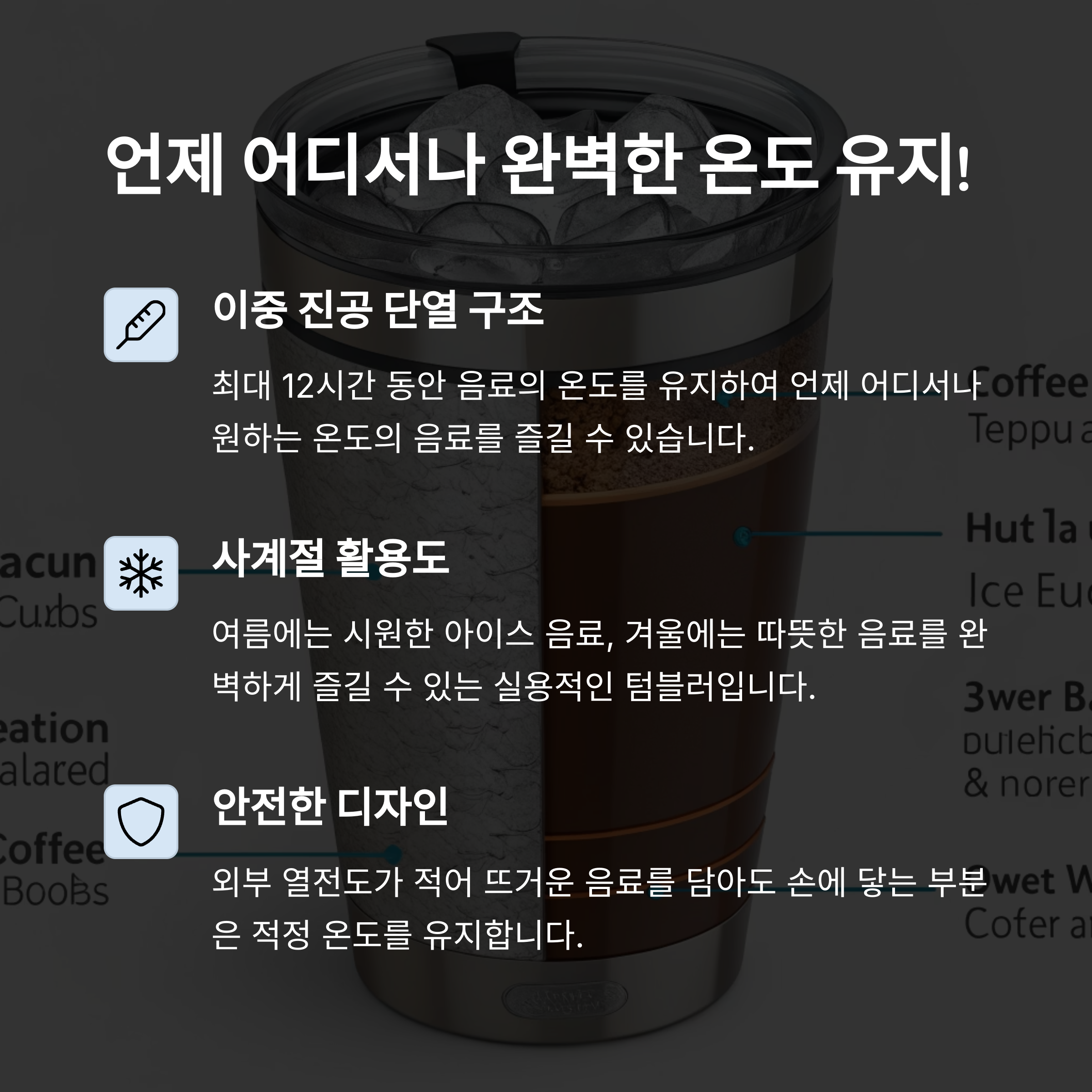 보온/보냉 기능이 뛰어나 오랫동안 일정한 음료 온도를 유지할 수 있습니다.